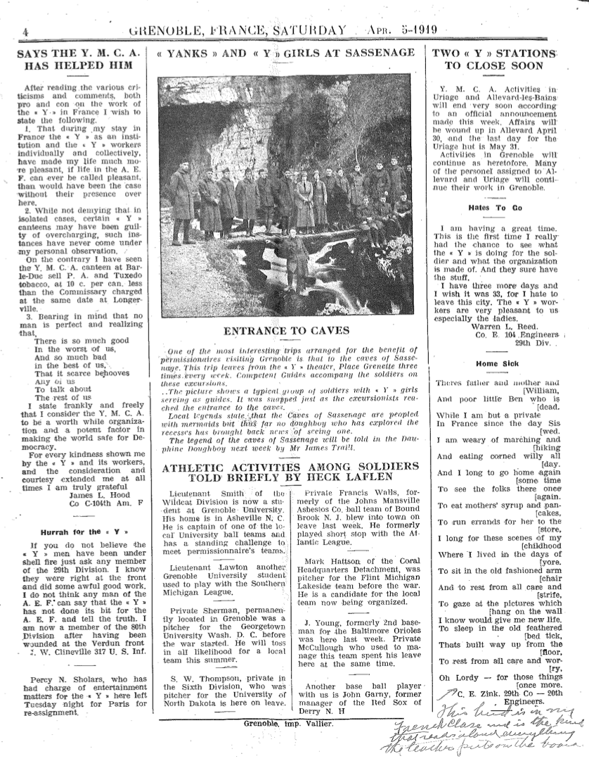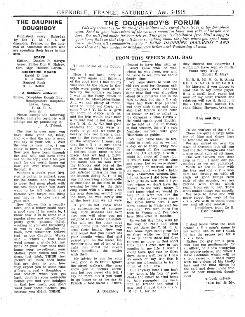 Not exactly a personal letter but still a message home from the front, The Dauphine Doughboy was published for American troops stationed near Grenoble, France. Thousands of US soldiers were kept in France after Armistice Day, usually sent into Germany as part of the occupation. The YMCA, in a role that was the forerunner of the USO, set up sites in Grenoble for rest and relaxation. Many doughboys went to Grenoble on leave, some for sightseeing, some to study in the university as special students. Note the first article in the newspaper – a self-congratulatory piece on censoring mail that took at least fifteen days to reach American shores.
