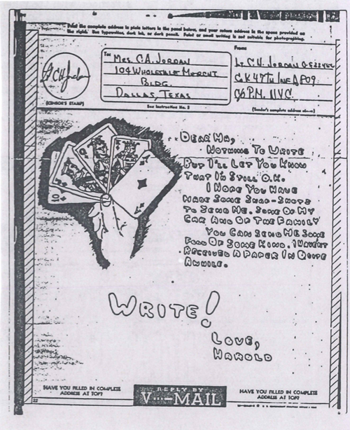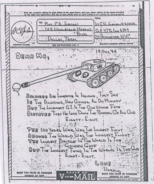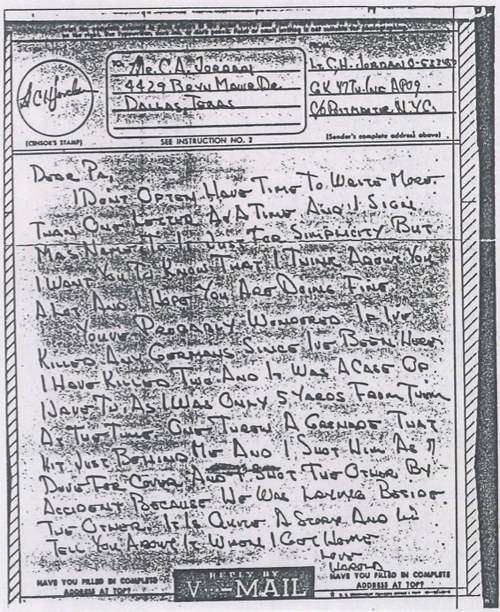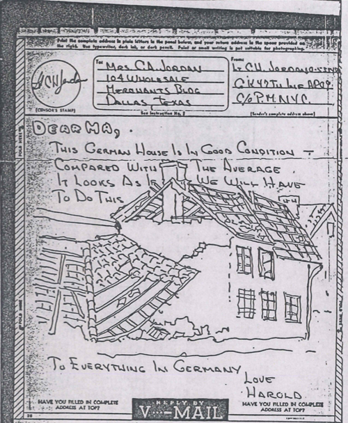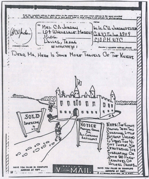 Letter Description: V Mails written to his parents in Dallas, Texas. Four of them are remarkable drawings he made. He was a graduate architect from Texas A&M. The fifth is a somewhat poignant letter to his father, saying that he is alive and well and that he had in fact killed some enemy soldiers. He was soon to be wounded, five weeks before the end of the war in Europe.