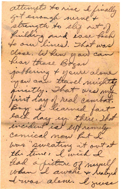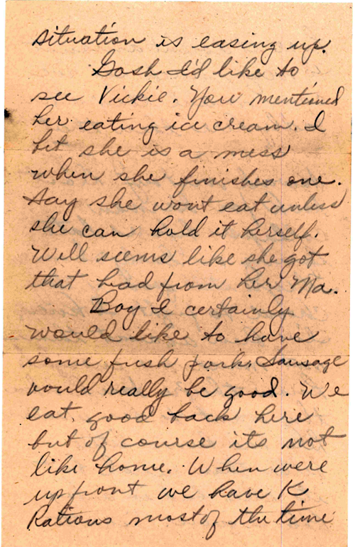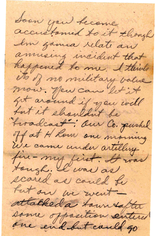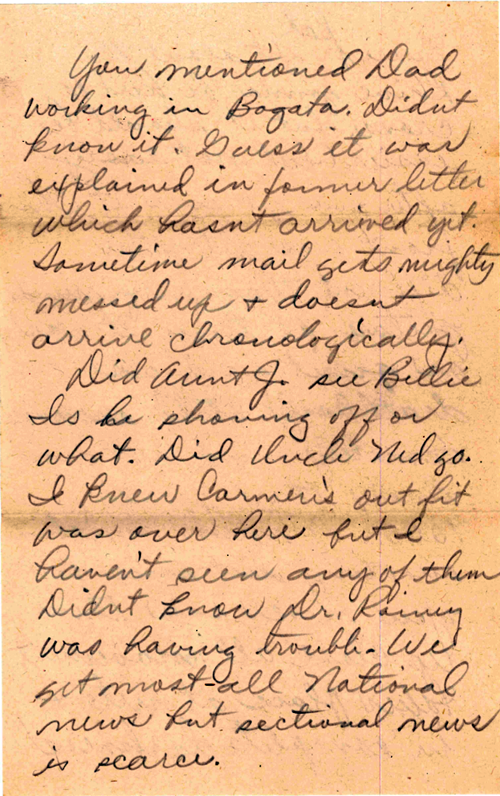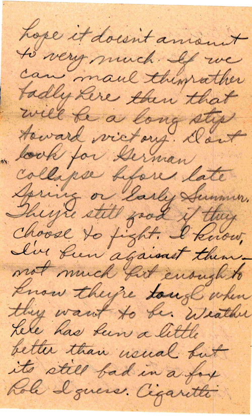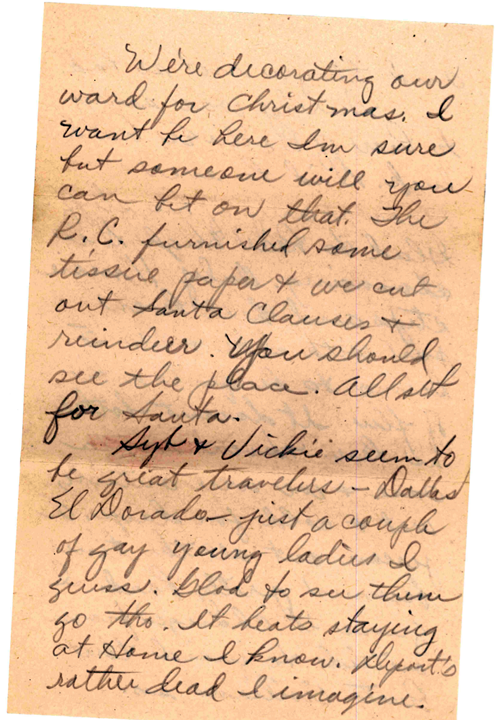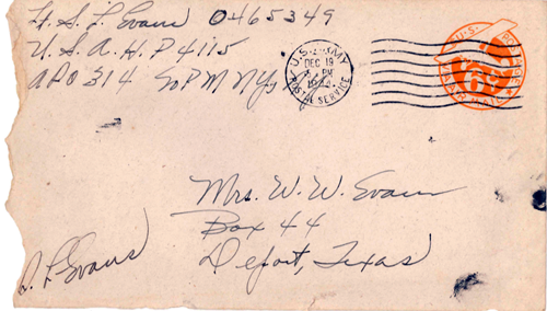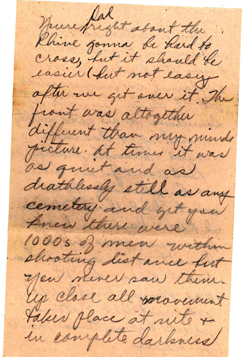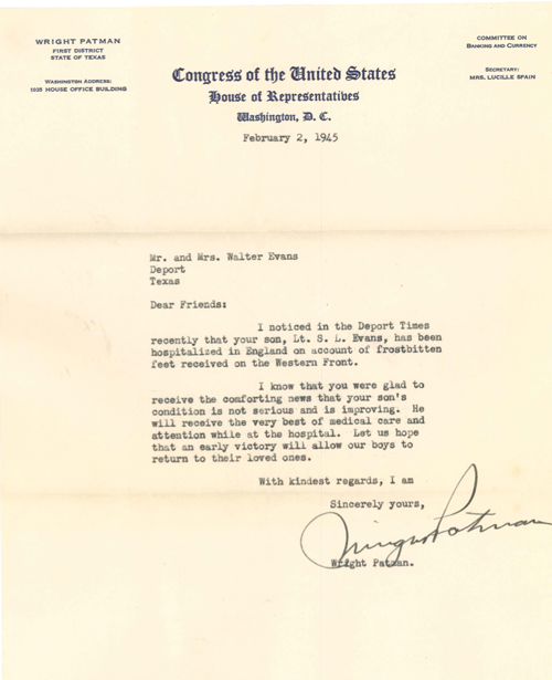 Letter Description: The long hand-written letter is not a v-mail. It was written December 18, 1944 in Belgium and mentions that the “Jerries” have started up something against the 1st and 9th Divisions and he hopes that the 1st and the 9th hit them pretty hard to speed up the end of the war. He had no idea, indeed his commanders had no idea, that this ‘push’ would become the Battle of the Bulge, a German thrust back into Belgium trying to capture Antwerp to block off Allied shipping and re-supply. It became the deadliest US single engagement of the war in Europe. The last letter is actually from a Congressman to his family comforting them about his being in the hospital.