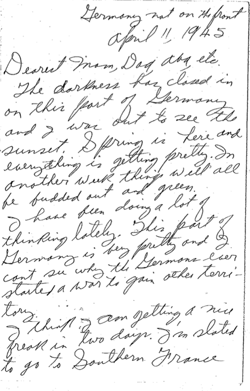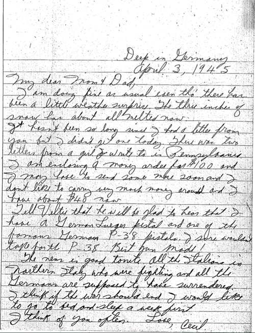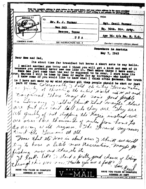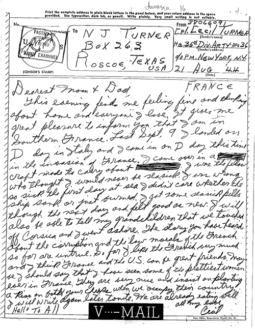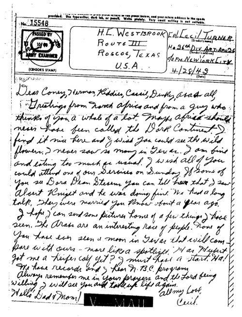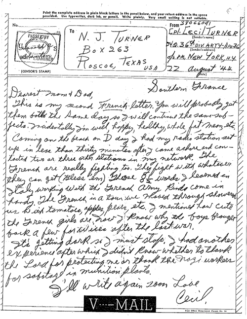 Letter Description: “Sgt. Cecil Turner, Hq., 36th Div., Artillery, reproduced with permission graciously given by his daughter, Kathie Jackson, author of “So Great a Heritage, the inspiring WWII letters of Sergeant Turner.”
